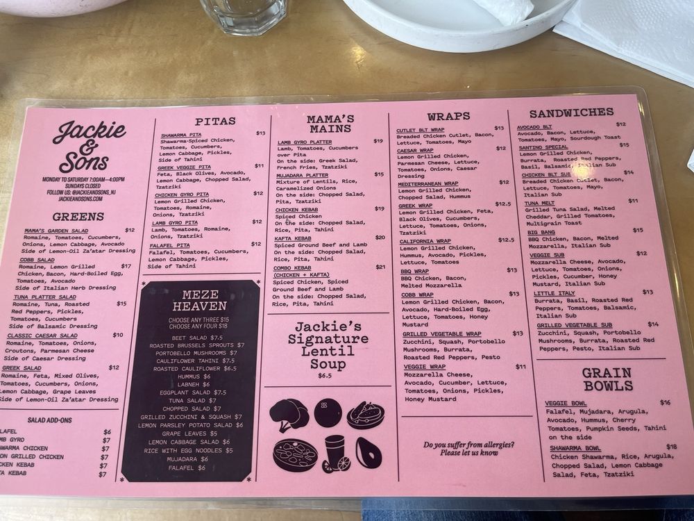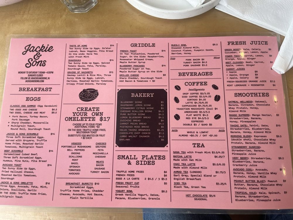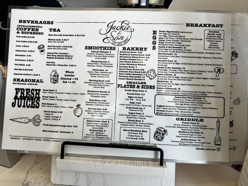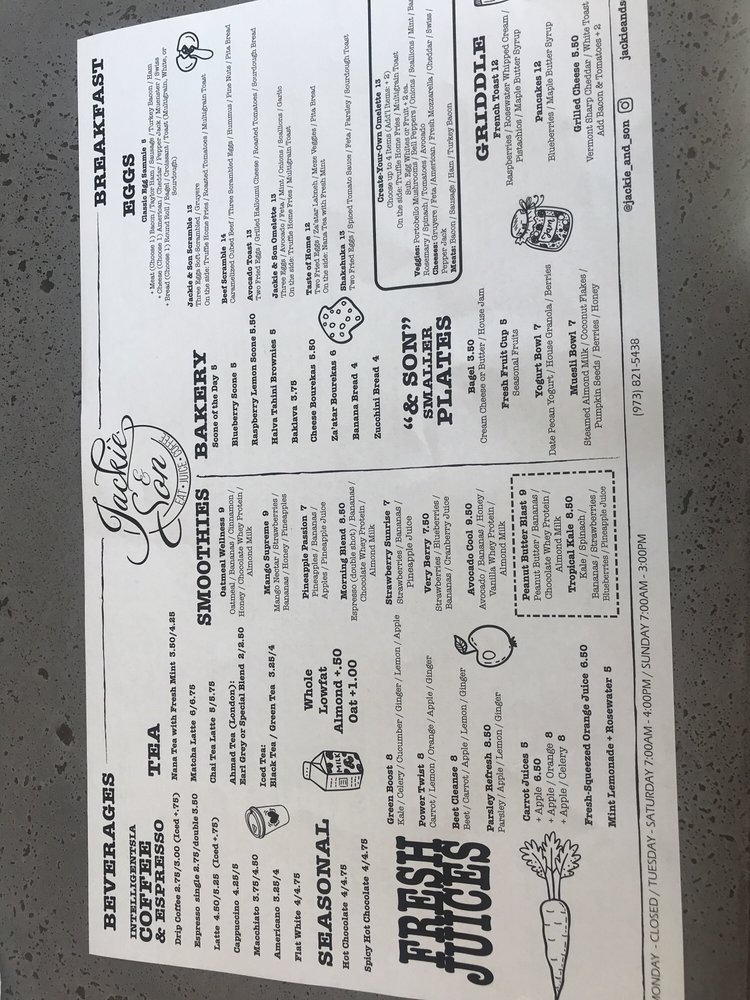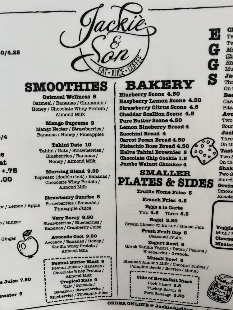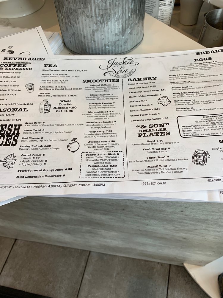 Welcome to Jackie and Sons, a Mediterranean-inspired café in South Orange, NJ, offering a delightful fusion of flavors in their menu. From their exquisite Intelligentsia Coffee and Espresso selections to a tantalizing array of freshly baked goods like Baklava and Lemon Blueberry Loaf, Jackie and Sons excels in providing a unique culinary experience. Customers rave about the friendly service, cozy atmosphere, and the range of vegan options available. Don't miss out on their Valentine's Day specials such as the Hazelnut S'Mores Scone or the Peach and Vanilla Bean Scone. Whether you're in the mood for a savory kebab combo or a refreshing Very Berry smoothie, Jackie and Sons is the ideal spot for a delicious meal. With sustainable practices like compostable containers and plastic-free packaging, this café is not only a culinary delight but also environmentally conscious. Experience the charm of Jackie and Sons and savor their delectable offerings today.